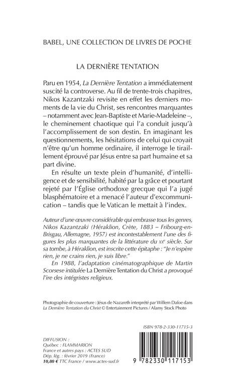 Paru en 1954, La Dernière Tentation a immédiatement suscité la controverse. Au fil de trente-trois chapitres, Nikos Kazantzaki revisite en effet les derniers moments de la vie du Christ, ses rencontres marquantes - notamment avec Jean-Baptiste et Marie- Madeleine -, le cheminement chaotique qui l'a conduit jusqu'à l'accomplissement de son destin. En imaginant les questionnements, les hésitations de celui qui croyait n'être qu'un homme ordinaire, il interroge le tiraillement éprouvé par Jésus entre sa part humaine et sa part divine.
