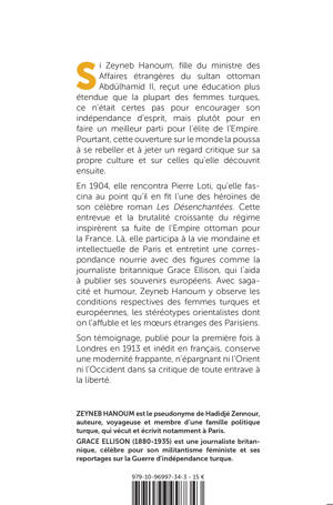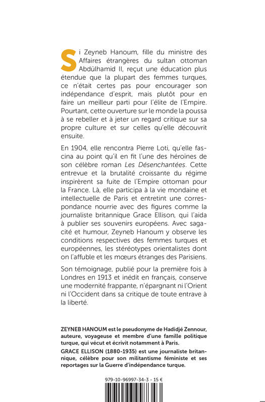 Si Zeyneb Hanoum — nom de plume de Hadidjé Zennour, fille duministre des Affaires étrangères du sultan ottoman Abdülhamid II — reçut uneéducation plus étendue que la plupart de ses concitoyennes, ce n’était certespas pour encourager son indépendance d’esprit, mais plutôt pour en faire unmeilleur parti pour l’élite de l’Empire. Toutefois, cette ouverture sur lemonde, alliée à sa forte volonté, la poussa à se rebeller contre le sort qui luiétait destiné et à jeter un regard critique tant sur sa propre culture que surcelles qu’elle connut ensuite. En 1904, elle rencontraà Istamboul Pierre Loti, qu’elle fascina tant qu’il en fit l’une des héroïnes deson roman Les Désenchantées ; cette amitié, avec la brutalité croissante durégime hamidien, lui inspira le plan de fuir l’Empire ottoman pour la France, cequ’elle fit en 1906. Accompagnée de sa soeur, elle participa à la vie mondaineet intellectuelle de Paris et elle entretint une importante correspondance avecdes figures telles que la journaliste britannique Grace Ellison. C’est cettedernière qui la poussa à publier ses souvenirs européens (dont Grace Ellison futla préfacière), où elle observe avec sagacité et humour les conditionsrespectives des femmes turques et européennes, les stéréotypes orientalistesdont on l’affuble et les moeurs étranges des Parisiens.Son témoignage, publié pour la première fois à Londres en 1913 et inédit enfrançais, conserve une modernité frappante, n’épargnant ni l’Orient, nil’Occident dans sa critique de toute entrave à la liberté.