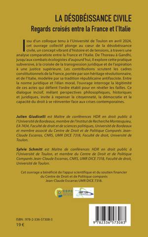 Issu d'un colloque tenu à l'Université de Toulon en avril 2024, cet ouvrage collectif plonge au coeur de la désobéissance civile, un concept vibrant d'histoire et de tensions, à travers une analyse comparatiste entre la France et l'Italie. De Thoreau à Gandhi, jusqu'aux combats écologistes d'aujourd'hui, il explore cette pratique subversive, à la croisée de la transgression juridique et de l'aspiration à une justice supérieure. Les contributions scrutent les cadres constitutionnels de la France, portée par son héritage révolutionnaire, et de l'Italie, modelée par sa tradition républicaine antifasciste. Entre la norme juridique et l'élan moral, l'ouvrage interroge la légitimité de ces actes qui défient l'ordre établi pour en révéler les failles. Ce dialogue incisif, mêlant perspectives philosophiques, historiques et juridiques, invite à repenser la citoyenneté, la démocratie et la capacité du droit à se réinventer face aux crises contemporaines.