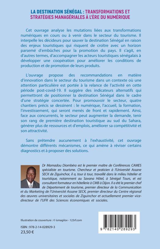Cet ouvrage analyse les mutations liées aux transformations numériques en cours ou à venir dans le secteur du tourisme. Il interpelle les décideurs pour sauver la destination Sénégal en raison des enjeux touristiques qui risquent de croître avec un horizon parsemé d'embûches pour la promotion du pays. L'ouvrage propose des recommandations en matière d'innovation dans le secteur du tourisme dans un contexte où une attention particulière est portée à la relance de l'activité en cette période post-covid-19.