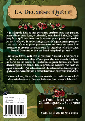 « Je m’appelle Ema et mes personnes préférées sont mes parents, ma meilleure amie Rose, et Almarick, mon fiancé. Enfin, lui, c’était jusqu’à ce qu’il me laisse sur le carreau pour partir en mission au service du roi… Et notre mariage, alors ? N’ai-je aucune importance à ses yeux ? Ça ne va pas se passer comme ça : je vais me lancer à ses trousses et lui prouver que je suis tout à fait capable de rester à ses côtés. Partir à l’aventure ne doit pas être si compliqué, pas vrai ? » Une simple lettre : voilà tout ce que laisse Almarick à Ema quand il la plante là, dans son village d’Auln, pour aller une nouvelle fois jouer les héros sur les routes de Vilaltierre. La jeune femme, qui rêvait d’accompagner son fiancé dans sa prochaine aventure, voit tous ses espoirs s’écrouler. Qu’à cela ne tienne ! Elle se lance alors dans sa propre quête, certes deuxième par la circonstance mais nullement secondaire. Un roman de cosy fantasy à la saveur réconfortante, délicatement relevée d’un zeste de romance. Un nuage de douceur dans ce monde de brutes !