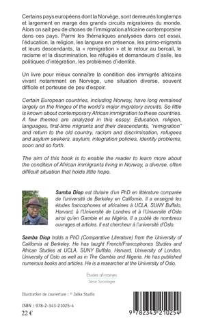 Certains pays européens, dont la Norvège, sont demeurés longtemps et largement en marge des grands circuits migratoires du monde. De nombreuses thématiques sont analysées dans cet essai : l'éducation, la religion, les langues en présence, les primo-migrants et leurs descendants, la « remigration » et le retour au bercail, le racisme et la discrimination, les réfugiés et demandeurs d'asile, les politiques d'intégration, les problèmes d'identité. Un livre pour mieux connaître la condition des immigrés africains vivant notamment en Norvège, une situation diverse, souvent difficile et porteuse de peu d'espoir.