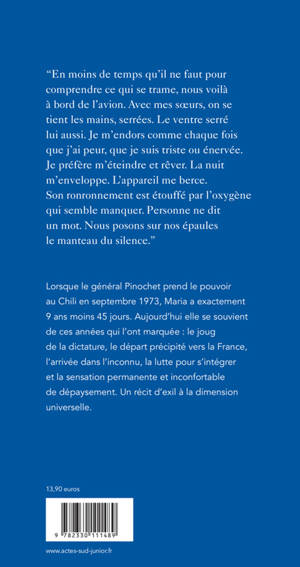 Le 11 septembre 1973, la radio des parents de Maria se met à grésiller : le général Pinochet a accédé à la présidence du Chili, soutenu par un coup d'État meurtrier perpétré par l'armée. Les années de plomb qui suivent cet événement vont envoyer vers l'exil des milliers d'opposants chiliens, dont Maria et sa famille. Arrivés à Paris, puis à Lyon, les Poblete vont devoir s'adapter aux us et coutumes si curieux et si différents des leurs tout en contemplant, de loin, la lutte qui s'opère dans leur pays natal. Une adolescence particulière...