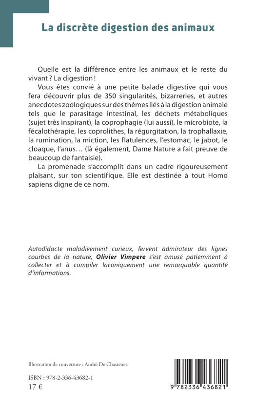 Quelle est la différence entre les animaux et le reste du vivant ? La digestion ! Vous êtes convié à une petite balade digestive qui vous fera découvrir plus de 350 singularités, bizarreries, et autres anecdotes zoologiques sur des thèmes liés à la digestion animale tels que le parasitage intestinal, les déchets métaboliques (sujet très inspirant), la coprophagie (lui aussi), le microbiote, la fécalothérapie, les coprolithes, la régurgitation, la trophallaxie, la rumination, la miction, les flatulences, l'estomac, le jabot, le cloaque, l'anus... (là également, Dame Nature a fait preuve de beaucoup de fantaisie). La promenade s'accomplit dans un cadre rigoureusement plaisant, sur ton scientifique. Elle est destinée à tout Homo sapiens digne de ce nom.