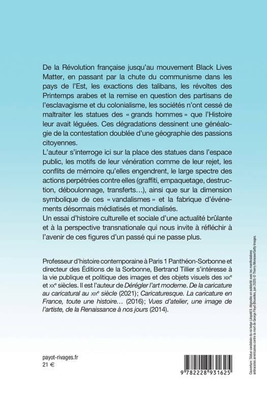 De la Révolution française jusqu'au mouvement Black Lives Matter, en passant par la chute du communisme dans les pays de l'Est, les exactions des talibans, les révoltes des Printemps arabes et la remise en question des partisans de l'esclavagisme et du colonialisme, les sociétés n'ont cessé de maltraiter les statues des « grands hommes » que l'Histoire leur avait léguées. Ces dégradations dessinent une généalogie de la contestation doublée d'une géographie des passions citoyennes. L'auteur s'interroge ici sur la place des statues dans l'espace public, les motifs de leur vénération comme de leur rejet, les conflits de mémoire qu'elles engendrent, le large spectre des actions perpétrées contre elles (graffiti, empaquetage, destruction, déboulonnage, transferts...), ainsi que sur la dimension symbolique de ces « vandalismes » et la fabrique d'événements désormais médiatisés et mondialisés. Un essai d'histoire culturelle et sociale d'une actualité brûlante et à la perspective transnationale qui nous invite à réfléchir à l'avenir de ces figures d'un passé qui ne passe plus.