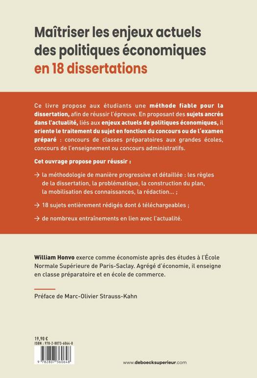 Ce livre propose aux étudiants une méthode fiable pour la dissertation, afin de réussir l’épreuve. En proposant des sujets ancrés dans l’actualité, liés aux enjeux actuels de politiques économiques, il oriente le traitement du sujet en fonction du concours ou de l‘examen préparé : concours de classes préparatoires aux grandes écoles, concours de l’enseignement ou concours administratifs.