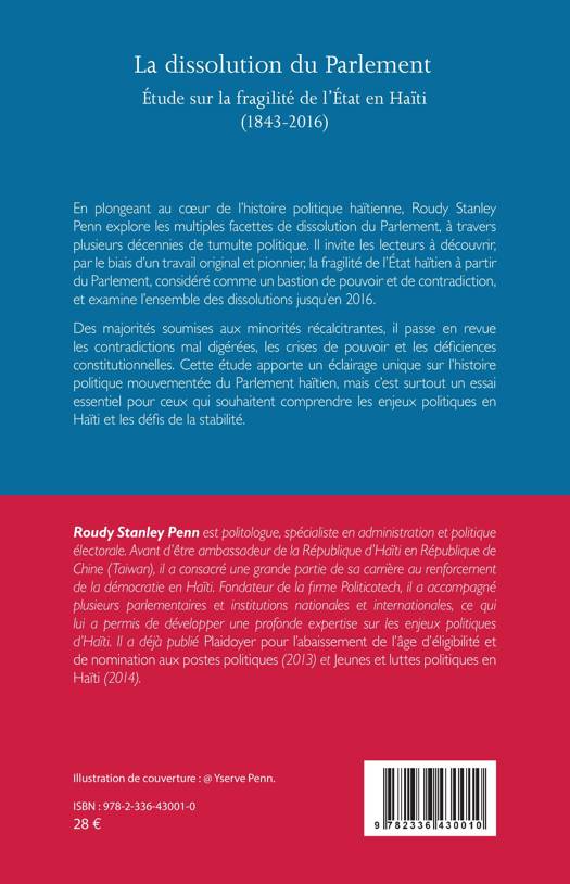 En plongeant au coeur de l'histoire politique haïtienne, Roudy Stanley Penn explore les multiples facettes de dissolution du Parlement, à travers plusieurs décennies de tumulte politique. Il invite les lecteurs à découvrir, par le biais d'un travail original et pionnier, la fragilité de l'État haïtien à partir du Parlement, considéré comme un bastion de pouvoir et de contradiction, et examine l'ensemble des dissolutions jusqu'en 2016. Des majorités soumises aux minorités récalcitrantes, il passe en revue les contradictions mal digérées, les crises de pouvoir et les déficiences constitutionnelles. Cette étude apporte un éclairage unique sur l'histoire politique mouvementée du Parlement haïtien, mais c'est surtout un essai essentiel pour ceux qui souhaitent comprendre les enjeux politiques en Haïti et les défis de la stabilité.