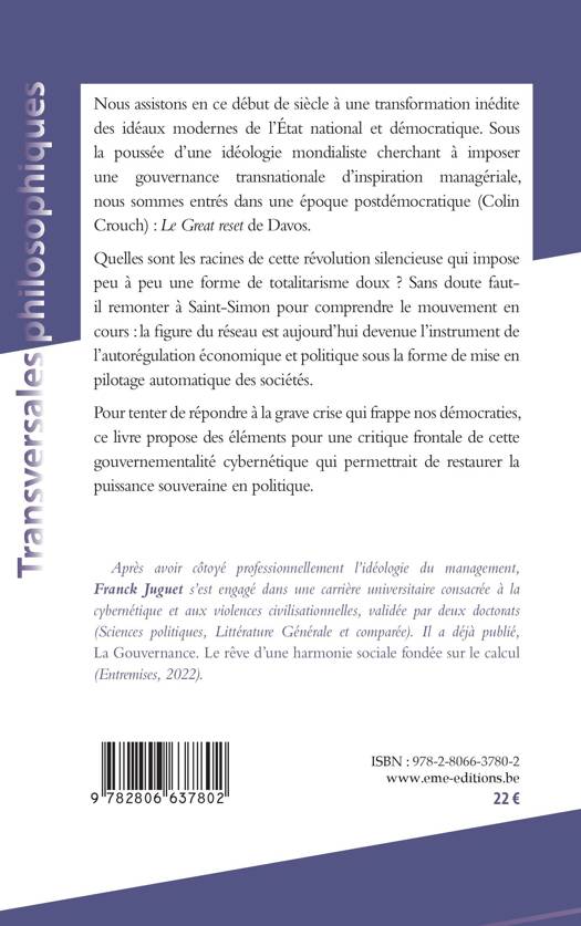 Le rêve d'une France adaptée à la mondialisation se heurte à des réalités comptables et technocratiques ; les sacrifices demandés ne semblent plus avoir de fin. Le concept de « gouvernance » s'est imposé, se définissant avant tout comme une technique de gestion et de légitimation sociale. C'est une conception alternative de la démocratie qui met en crise nos institutions. Face à l'hubris de l'accumulation et de la toute-puissance de l'homme, il nous faut d'urgence retrouver le sens des limites.