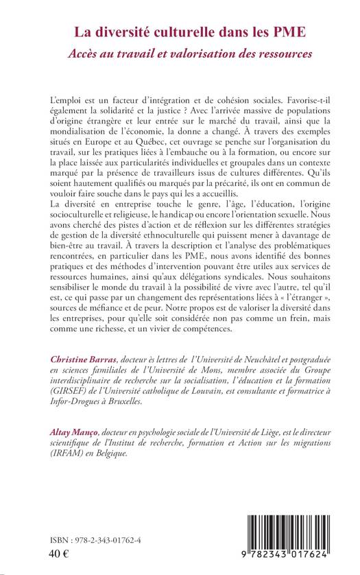 L’emploi est un facteur d’intégration et de cohésion sociales. À travers des exemples situés en Europe et au Québec, cet ouvrage se penche sur l’organisation du travail, sur les pratiques liées à l’embauche ou à la formation, ou encore sur la place laissée aux particularités individuelles et groupales dans un contexte marqué par la présence de travailleurs issus de cultures différentes. Le propos est de valoriser la diversité dans les entreprises, qu'elle soit considérée comme une richesse et un vivier de compétences.