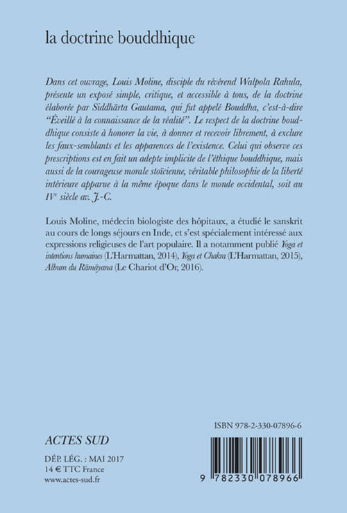 Dans ce livre, Louis Moline, disciple du révérend Walpola Rahula, présente un exposé simple, critique, et accessible à tous, de la doctrine élaborée par Siddharta Gautama, qui fut appelé Bouddha, c'est-à-dire "Éveillé à la connaissance de la réalité". Le respect de la doctrine bouddhique consiste à honorer la vie, à donner et recevoir librement, à exclure les faux-semblants et les apparences de l'existence. Celui qui observe ces prescriptions, sans solliciter l'assistance d'un Dieu régissant l'Univers ni croire à la survie de son "Ego" dans l'au-delà, est en fait un adepte implicite de l'éthique bouddhique, mais également de la courageuse morale stoïcienne, véritable philosophie de la liberté intérieure apparue à la même époque dans le monde occidental, soit au IVe siècle avant JC.