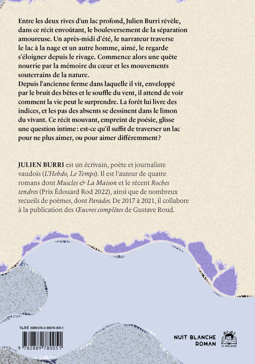 Entre les deux rives d’un lac profond, Julien Burri révèle, dans ce récit envoûtant, le bouleversement de la séparation amoureuse. Un après-midi d’été, le narrateur traverse le lac à la nage et un autre homme, aimé, le regarde s’éloigner depuis le rivage. Commence alors une quête nourrie par la mémoire du coeur et les mouvements souterrains de la nature. <br /> Depuis l’ancienne ferme dans laquelle il vit, enveloppé par le bruit des bêtes et le souffle du vent, il attend de voir comment la vie peut le surprendre. La forêt lui livre des indices, et les pas des absents se dessinent dans le limon du vivant. Ce récit mouvant, empreint de poésie, glisse une question intime: est-ce qu’il suffit de traverser un lac pour ne plus aimer, ou pour aimer différemment?