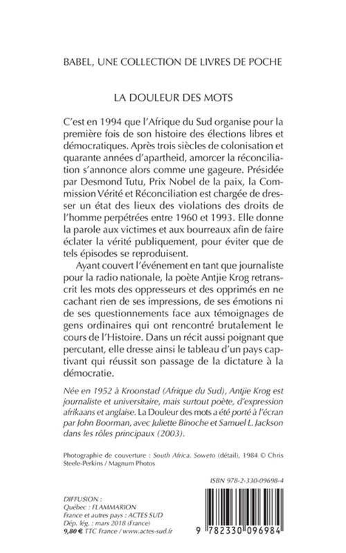 Ayant couvert l'événement en tant que journaliste pour la radio nationale, la poète Antjie Krog retranscrit les mots des oppresseurs et des opprimés en ne cachant rien de ses impressions, de ses émotions ni de ses questionnements face aux témoignages de gens ordinaires qui ont rencontré brutalement le cours de l'Histoire. Dans un récit aussi poignant que percutant, elle dresse ainsi le tableau d'un pays captivant qui réussit son passage de la dictature à la démocratie.