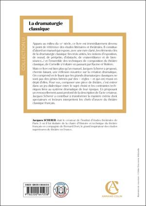 Nouvelle édition revue par Colette Scherer Préface de Georges Forestier Apparu au milieu du XXe siècle, ce livre est immédiatement devenu le point de référence des études littéraires et théâtrales. Il constitue d’abord un manuel qui expose, avec une rare clarté, les éléments clés de la dramaturgie classique (les trois unités, les notions d’exposition, de nœud, de péripétie, d’obstacle, de vraisemblance et de bienséance...) et l’ensemble des techniques de composition du théâtre classique, de Corneille à Voltaire en passant par Racine et Molière. Mais ce livre est bien plus qu’un manuel. Jacques Scherer a proposé, chemin faisant, une réflexion novatrice sur la création dramatique. On comprend en le lisant que les grands dramaturges classiques ne sont pas des génies brimés par des « règles » et qui ont réussi en dépit d’elles ; pour eux, compo ser une pièce de théâtre, c’est entrer dans un jeu dialectique entre le sujet choisi et les contraintes techniques liées au système dramatique de leur époque. En proposant un renouvellement aussi profond de la description de l’acte créateur, Jacques Scherer a contribué à transformer la manière même dont spectateurs et lecteurs interprètent les chefs-d’œuvre du théâtre classique français.