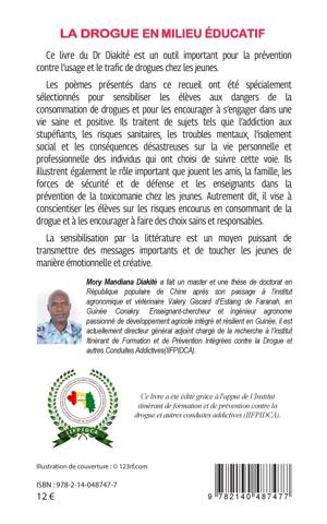 Ce livre du Dr Diakité est un outil important pour la prévention contre l'usage et le trafic de drogues chez les jeunes. Les poèmes présentés dans ce recueil ont été spécialement sélectionnés pour sensibiliser les élèves aux dangers de la consommation de drogues et pour les encourager à s'engager dans une vie saine et positive. Ils traitent de sujets tels que l'addiction aux stupéfiants, les risques sanitaires, les troubles mentaux, l'isolement social et les conséquences désastreuses sur la vie personnelle et professionnelle des individus qui ont choisi de suivre cette voie. Ils illustrent également le rôle important que jouent les amis, la famille, les forces de sécurité et de défense et les enseignants dans la prévention de la toxicomanie chez les jeunes.