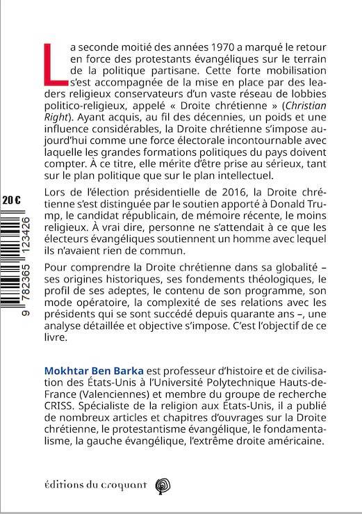 La seconde moitié des années 1970 a marqué le retour en force des protestants évangéliques. Cette forte mobilisation s’est accompagnée de la mise en place par des leaders religieux conservateurs d’un vaste réseau de lobbies politico-religieux, appelé « Droite chrétienne ». Celle-ci s’impose comme une force électorale avec laquelle les grandes formations politiques doivent compter. <br /> Après avoir apporté, en 1980, une aide décisive à Ronald Reagan, elle a soutenu George W. Bush (un born again Christian), allié fidèle et puissant. Pourtant, leurs relations étaient plus complexes qu’on ne le croyait. En 2016, elle a soutenu Donald Trump, pourtant un homme avec lequel elle n’avait rien de commun.<br /> Pour comprendre la Droite chrétienne dans sa globalité – ses origines historiques, ses fondements théologiques, le profil de ses adeptes, le contenu de son programme, son mode opératoire –, une analyse détaillée et objective s’impose. C’est l’objectif de ce livre.