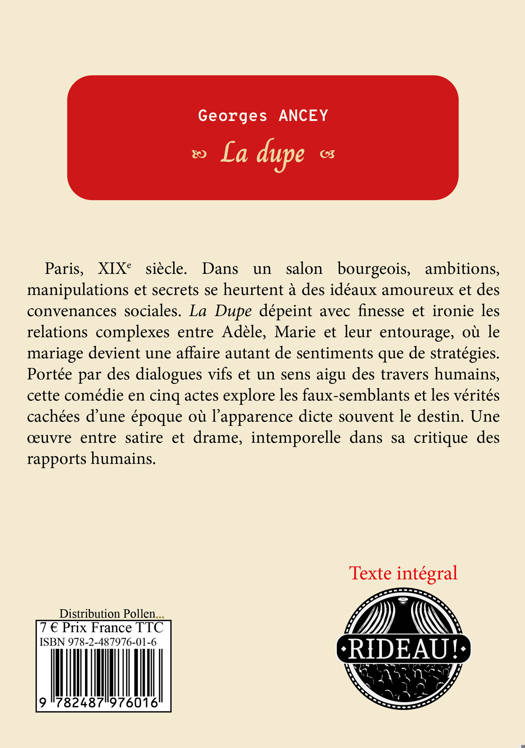 Paris, XIXe siècle. Dans un salon bourgeois, ambitions,manipulations et secrets se heurtent à des idéaux amoureux et des convenancessociales. La Dupe dépeint avec finesse et ironie les relations complexes entreAdèle, Marie et leur entourage, où le mariage devient une affaire autant desentiments que de stratégies. Portée par des dialogues vifs et un sens aigu destravers humains, cette comédie en cinq actes explore les faux-semblants et lesvérités cachées d’une époque où l’apparence dicte souvent le destin. Une oeuvreentre satire et drame, intemporelle dans sa critique des rapports humains.