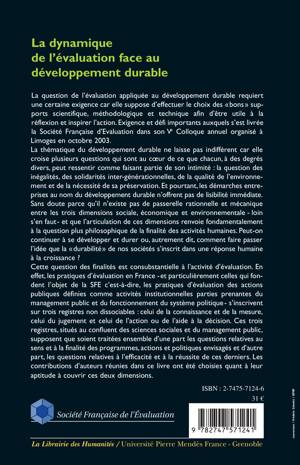 Les démarches entreprises au nom du développement durable n'offrent pas toujours de lisibilité immédiate. Peut-on continuer à se développer et durer ou comment faire passer l'idée que la "durabilité" de nos sociétés s'inscrit dans une réponse humaine à la croissance. Cette question des finalités est consubstantielle à l'activité d'évaluation que cette étude questionne.