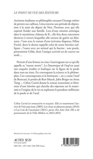 Ancienne étudiante en philosophie exerçant l'étrange métier de peintre sur cailloux, Léna traverse une période de dépression à la suite du départ de Noé, l'homme avec qui elle espérait fonder une famille. Lors d'une mission artistique dans le mystérieux château de K., elle fera deux rencontres décisives à travers lesquelles elle tentera de guérir ses blessures : l'une avec le roman d'une écrivaine disparue, Féline Furiol, dont le destin rappelle celui de notre héroïne nullipare ; l'autre avec un animal qui la fascine : une poule, prénommée Gilda, dont l'unique activité est de couver ses oeufs... Portrait d'une femme en crise s'interrogeant sur ce qu'elle appelle sa "nature morte", La Dynamique de l'oeuf est aussi une enquête érudite et loufoque sur la figure de la poule dans tous ses états. En convoquant la science et la philosophie, l'art contemporain et la littérature - on y croise l'oeuf de Brancusi, le poulet de Ron Mueck, John Berger ou Anna Tsing -, Céline Curiol donne le roman iconoclaste et féministe d'une héroïne qui cherche des réponses sur la maternité et l'origine de la vie en explorant le paradoxe millénaire de la poule et de l'oeuf.