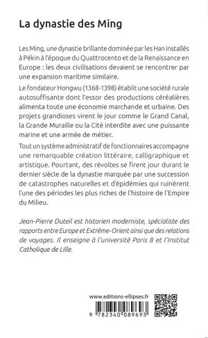 Les Ming, une dynastie ou plutôt une période qui fait rêver par ses décors de porcelaine bleue et blanche et l’enroulement sans fin de la queue du dragon impérial. Dynastie brillante dominée par les Han installés à Pékin à l’époque du Quattrocento et de la Renaissance en Europe ; les deux civilisations devaient se rencontrer par une expansion maritime similaire, une découverte inquiète et remplie des mystères orientaux.