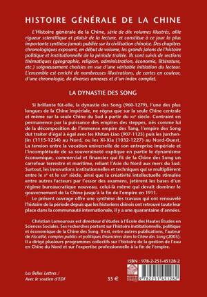 HISTOIRE GENERALE DE LA CHINE L'Histoire generale de la Chine, serie de dix volumes illustres, allie rigueur scientifique et plaisir de la lecture, et constitue a ce jour la plus importante synthese jamais publiee sur la civilisation chinoise. Des chapitres chronologiques exposent, en debut de volume, les grands jalons de l'histoire politique et institutionnelle de la periode traitee. Ils sont suivis de sections thematiques (geographie, religion, administration, economie, litterature, etc.) soigneusement choisies en vue d'une veritable initiation du lecteur. L'ensemble est enrichi de nombreuses illustrations, de cartes en couleur, d'une chronologie, de diverses annexes et d'un index complet. LA DYNASTIE DES SONG Si brillante fut-elle, la dynastie des Song (960-1279), l'une des plus longues de la Chine imperiale, ne regna que sur la seule Chine centrale et meme sur la seule Chine du Sud a partir du XIIe siecle. Contraint en permanence par la puissance des empires des steppes, nes comme lui de la decomposition de l'immense empire des Tang, l'empire des Song dut traiter d'egal a egal avec les Khitan-Liao (907-1125) puis les Jurchen-Jin (1115-1234) au Nord, ou les Xi-Xia (1032-1227) au Nord-Ouest. La tension entre la vocation universelle de son entreprise imperiale et l'incompletude de sa souverainete explique en partie le dynamisme economique, commercial et financier qui fit de la Chine des Song un carrefour terrestre et maritime, reliant l'Asie du Nord aux mers du Sud. Surtout, les innovations institutionnelles et techniques qui se multiplierent entre le Xe et le XIIIe siecle, ainsi que la creativite intellectuelle stimulee entre autres facteurs par l'essor des examens, jeterent les bases d'un regime bureaucratique nouveau, celui-la meme qui devait dominer le gouvernement de la Chine jusqu'a la fin de l'empire en 1911. Le present ouvrage offre une synthese des travaux qui ont renouvele l'histoire de la periode depuis que les historiens chinois ont retrouve toute leur place dans la communaute internationale, il y a une quarantaine d'annees.
