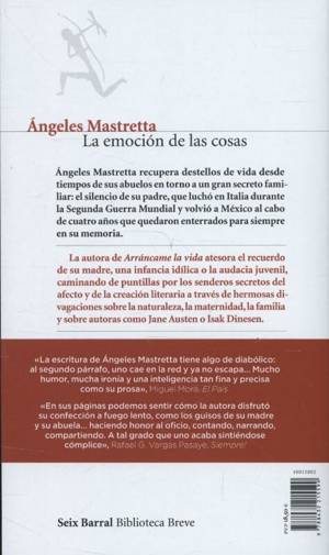 En La emoción de las cosas Angeles Mastretta indaga en un gran secreto familiar: el silencio de su padre, que luchó en Italia durante la segunda guerra mundial y volvió a México al cabo de cuatro años que quedaron enterrados para siempre en su memoria. A través de recuerdos, intuiciones e impresiones, atesora el recuerdo de su madre, recupera detalles de vida desde tiempos de sus abuelos hasta el día de hoy, caminando de puntillas por hermosas divagaciones sobre la escritura, la maternidad, la familia, sobre autores como Jane Austen o Isak Dinesen, el miedo, la religión o la muerte. En esta novel personal que nace de las entrañas, la autora de Arráncame la vida entona un canto de sirena que envuelve y seduce.