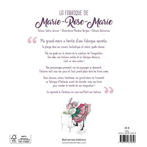 Aujourd’hui, ma grand-mère m’a révélé son plus grand secret : sa fabrique extraordinaire, source d'innombrables merveilles. Une fois franchi un portail majestueux, nous avons pénétré dans le pays de l’imagination, peuplé de lucioles, de pirates et de dragons. Quand elle s’est assise dans son fauteuil, les rouages de la fabrique se sont mis à tourner et la magie a commencé. Grâce à notre créativité, des personnages prirent vie et des paysages se dessinèrent sous nos yeux, créant une histoire merveilleuse. Et quand notre récit toucha à sa fin, un nouveau livre était né ! Un jour, moi aussi, je pourrai créer des histoires comme elle...