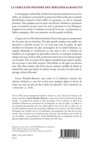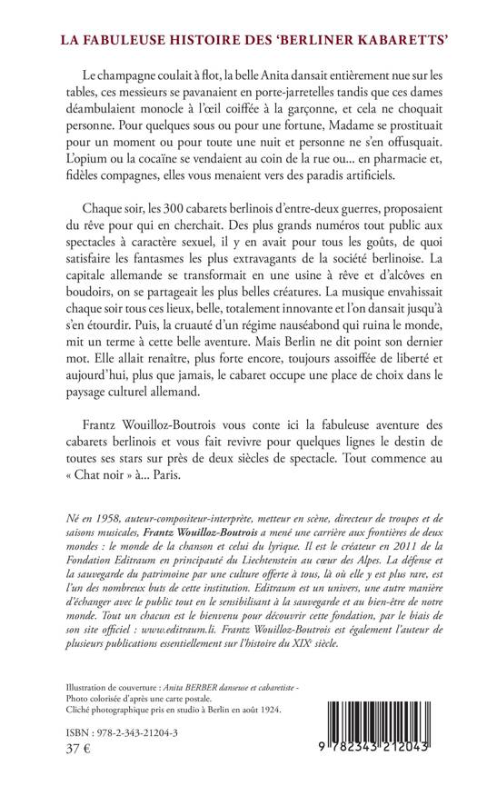 Chaque soir, les 300 cabarets berlinois d'entre-deux guerres, proposaient du rêve pour qui en cherchait. Des plus grands numéros tout public aux spectacles à caractère sexuel, il y en avait pour tous les goûts. La capitale allemande se transformait en une usine à rêve et d'alcôves en boudoirs, on se partageait les plus belles créatures au son d'une musique belle et totalement innovante. Le régime nazi mit un terme à cette belle aventure. Mais Berlin ne dit point son dernier mot et aujourd'hui, plus que jamais, le cabaret occupe une place de choix dans le paysage culturel allemand. Frantz Wouilloz-Boutrois vous conte ici la fabuleuse aventure des cabarets berlinois et vous fait revivre pour quelques lignes le destin de toutes ses stars sur près de deux siècles de spectacle. Tout commence au « Chat noir » à... Paris.