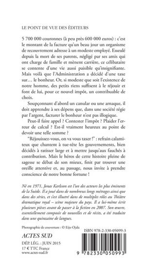Soupçonnant d'abord un canular ou une arnaque, il doit apprendre à ses dépens que, dans une société régie par l'argent, facturer le bonheur n'est pas illo gique. Peut-il faire appel ? Contester l'impôt ? Plaider l'erreur de calcul ? Est-il vraiment heureux au point de devoir une telle somme ?