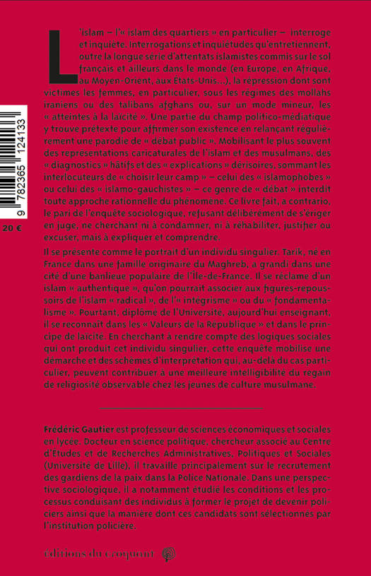 La famille, la cité, l’école et la mosquée Sociogenèse de la religiosité d’un jeune musulman d’aujourd’hui Frédéric Gautier L’islam – l’« islam des quartiers » en particulier – interroge et inquiète. Attentats et assassinats terroristes, violences d’État (Iran, Afghanistan...), « radicalisation », ou encore « atteintes à la laïcité » entretiennent ces interrogations et inquiétudes. Une partie du champ politico-médiatique y trouve prétexte pour affirmer son existence en relançant régulièrement une parodie de « débat public ». Mobilisant le plus souvent des représentations caricaturales, des « diagnostics » hâtifs et des « explications » dérisoires, sommant les interlocuteurs de « choisir leur camp » – celui des « islamophobes » ou celui des « islamo-gauchistes » – ce genre de « débat » interdit toute approche rationnelle de l’islam. Ce livre fait, a contrario, le pari de l’enquête sociologique, refusant délibérément de s’ériger en juge, ne cherchant ni à condamner, ni à réhabiliter, justifier ou excuser, mais à expliquer et comprendre. Il brosse le portrait d’un individu singulier. Tarik, né en France dans une famille originaire du Maghreb, a grandi dans une cité d’une banlieue populaire de la région parisienne. Il se réclame d’un islam « authentique », qu’on pourrait associer aux figures-repoussoirs de l’islam « radical », de l’« intégrisme » ou du « fondamentalisme ». Pourtant, diplômé de l’Université, aujourd’hui enseignant, il se reconnaît dans les « Valeurs de la République » et dans le principe de laïcité. En cherchant à rendre compte des logiques sociales qui ont produit cet individu singulier, cette enquête mobilise une démarche et des schèmes d’interprétation qui, au-delà du cas particulier, peuvent contribuer à une meilleure intelligibilité du regain de religiosité observable chez les jeunes de culture musulmane.