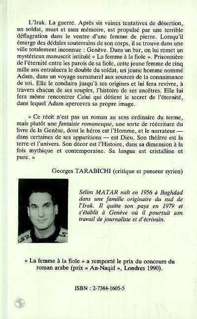 L'Irak. La guerre. Après six vaines tentatives de désertion, un soldat, muet et sans mémoire, est propulsé par une terrible déflagration dans le ventre d'une femme de pierre. Lorsqu'il émerge des dédales souterrains de son corps, il se trouve dans une ville totalement inconnue : Genève. Dans un bar, on lui remet un mystérieux manuscrit intitulé «La femme à la fiole». Prisonnière de l'éternité entre les parois de sa fiole, cette jeune femme de cinq mille ans entraînera le double du soldat, un jeune homme nommé Adam, dans un voyage surnaturel aux sources de la connaissance de soi. Elle le conduira jusqu'à ses origines et lui fera revivre, à travers chacun de ses soupirs, l'histoire de ses ancêtres. Elle lui fera même rencontrer Celui qui détient le secret de l'éternité, dans lequel Adam apercevra sa propre image.