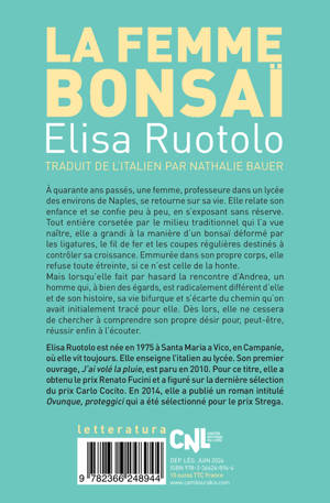 À quarante ans passés, une femme, professeure dans un lycée des environs de Naples, se retourne sur sa vie. Elle relate son enfance et se confie peu à peu, en s'exposant sans réserve. Tout entière corsetée par le milieu traditionnel qui l'a vue naître, elle a grandi à la manière d'un bonsaï déformé par les ligatures, le fil de fer et les coupes régulières destinés à contrôler sa croissance. Emmurée dans son propre corps, elle refuse toute étreinte, si ce n'est celle de la honte. Mais lorsqu'elle fait par hasard la rencontre d'Andrea, un homme qui, à bien des égards, est radicalement différent d'elle et de son histoire, sa vie bifurque et s'écarte du chemin qu'on avait initialement tracé pour elle. Dès lors, elle ne cessera de chercher à comprendre son propre désir pour, peut-être, réussir enfin à l'écouter.
