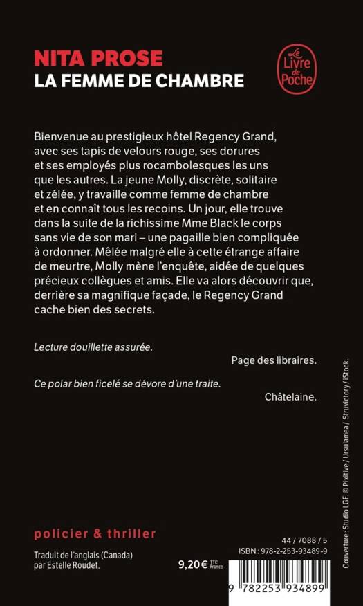 Bienvenue au prestigieux hôtel Regency Grand, avec ses tapis de velours rouge, ses dorures et ses employés plus rocambolesques les uns que les autres. La jeune Molly, discrète, solitaire et zélée, y travaille comme femme de chambre et en connaît tous les recoins. Un jour, elle trouve la richissime Mme Black dans sa suite, paniquée, aux côtés du corps sans vie de son mari – une pagaille bien compliquée à ordonner. Mêlée malgré elle à cette étrange affaire de meurtre, Molly mène l’enquête, aidée de quelques précieux collègues et amis. Elle va alors découvrir que, derrière la magnifique façade, le Regency Grand cache bien des secrets.