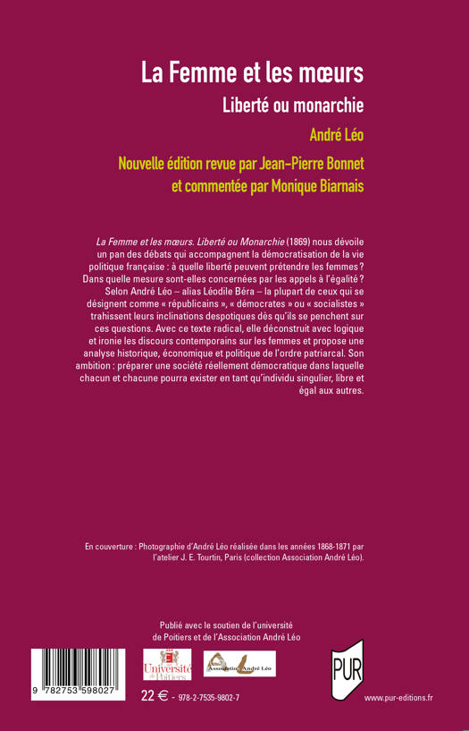 La Femme et les moeurs. Liberté ou Monarchie (1869) nous dévoile un pan des débats qui accompagnent la démocratisation de la vie politique française : à quelle liberté peuvent prétendre les femmes ? Dans quelle mesure sont-elles concernées par les appels à l’égalité ? Selon André Léo – alias Léodile Béra – la plupart de ceux qui se désignent comme « républicains », « démocrates » ou « socialistes » trahissent leurs inclinations despotiques dès qu’ils se penchent sur ces questions. Avec ce texte radical, elle déconstruit avec logique et ironie les discours contemporains sur les femmes et propose une analyse historique, économique et politique de l’ordre patriarcal. Son ambition : préparer une société réellement démocratique dans laquelle chacun et chacune pourra exister en tant qu’individu singulier, libre et égal aux autres.