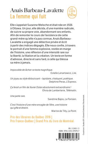 Un ouvrage incandescent de beauté. Divisé en courts chapitres comme autant de petits poèmes, polaroïds d'une époque, La Femme qui fuit raconte notre histoire à toutes.  Geneviève Patterson, Châtelaine.