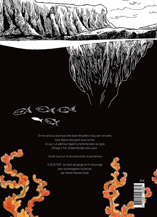 Au fond de la mer glacée de l'arctique git le squelette d'une femme que son père avait poussé là. Accroché à la ligne de pêche d'un inuit, le squelette est remonté à la surface. Emberlificotée à la ligne, la femme squelette suit le pêcheur jusqu'à son igloo. L'homme observe cet être étrange tapi dans l'ombre qui ne semble plus si effrayant et prend le temps de démêler son fil des os et de le réchauffer. Durant la nuit la femme squelette s'approche de son sauveteur et boit une larme. Le battement du coeur de l'homme raisonne comme un tambour, et petit à petit elle retrouve muscles, organes, peau, cheveux et tatouages. Cécile Vallade rend hommage aux paysages glacés et à la faune de l'arctique mais elle apporte aussi quelques touches d'humour à cette légende inuit sur la reconstruction d'une femme. La narration muette renforce le lien entre les deux personnages, et un chant de gorge dans la tradition inuit composé et enregistré par Marie-Pascale Dubé est accessible via des QR codes.