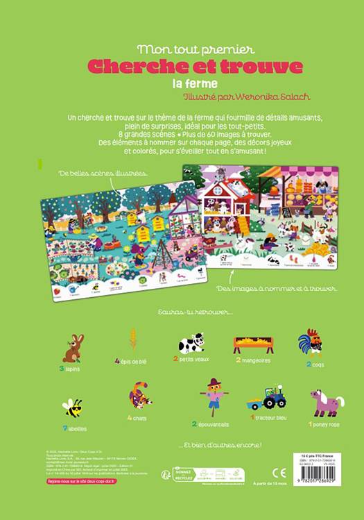 8 doubles pages de cherche et trouve sur la thématique de la ferme. 8 grandes scènes pleine d'humour pour les petits, plus de 60 éléments à observer attentivement et à retrouver : la grange, la basse-cour, le pré, le potager, la ferme équestre, les travaux des champs, la chèvrerie ou encore la ferme pédagogique.