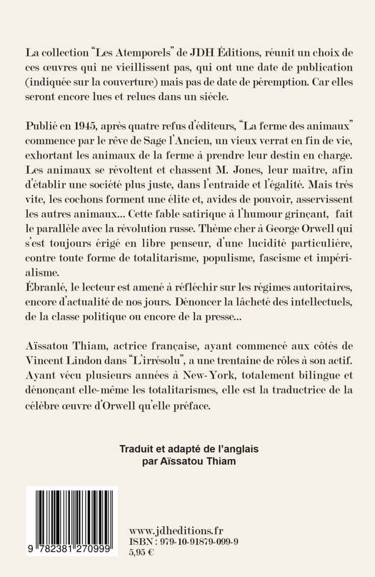 La collection "Les Atemporels" de JDH Éditions, réunit un choix de ces oeuvres qui ne vieillissent pas, qui ont une date de publication (indiquée sur la couverture) mais pas de date de péremption. Car elles seront encore lues et relues dans un siècle. Publié en 1945, après quatre refus d'éditeurs, "La ferme des animaux" commence par le rêve de Sage l'Ancien, un vieux verrat en fin de vie, exhortant les animaux de la ferme à prendre leur destin en charge. Les animaux se révoltent et chassent M. Jones, leur maître, afin d'établir une société plus juste, dans l'entraide et l'égalité. Mais très vite, les cochons forment une élite et, avides de pouvoir, asservissent les autres animaux... Cette fable satirique à l'humour grinçant, fait le parallèle avec la révolution russe. Thème cher à George Orwell qui s'est toujours érigé en libre penseur, d'une lucidité particulière, contre toute forme de totalitarisme, populisme, fascisme et impérialisme. Ébranlé, le lecteur est amené à réfléchir sur les régimes autoritaires, encore d'actualité de nos jours. Dénoncer la lâcheté des intellectuels, de la classe politique ou encore de la presse... Aïssatou Thiam, actrice française, ayant commencé aux côtés de Vincent Lindon dans "L'irrésolu", a une trentaine de rôles à son actif. Ayant vécu plusieurs années à New-York, totalement bilingue et dénonçant elle-même les totalitarismes, elle est la traductrice de la célèbre oeuvre d'Orwell qu'elle préface.