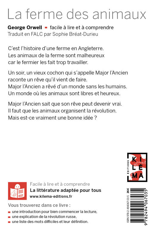UN LIVRE FACILE À LIRE ET À COMPRENDRE ! C’est l’histoire d’une ferme en Angleterre. Les animaux de la ferme sont malheureux car le fermier les fait trop travailler. Un soir, un vieux cochon qui s’appelle Major l’Ancien raconte un rêve qu’il vient de faire. Major l’Ancien a rêvé d’un monde sans les humains. Un monde où les animaux sont libres et heureux. Major l’Ancien sait que son rêve peut devenir vrai. Il faut que les animaux organisent la révolution. Mais est-ce vraiment une bonne idée ? ____ Le classique de George Orwell enfin accessible en FALC !