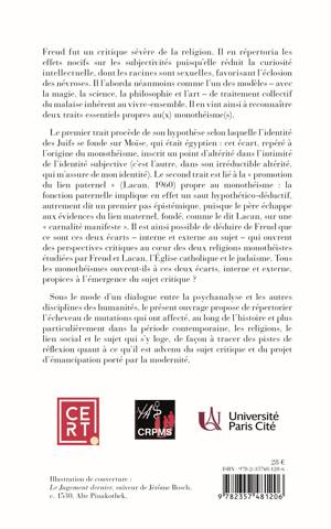 Freud, dans sa critique sévère de la religion, répertoria ses effets nocifs sur les subjectivités puisqu'elle réduit la curiosité intellectuelle, dont les racines sont sexuelles, favorisant l'éclosion des névroses. Il en vint néanmoins à reconnaître deux traits essentiels propres au(x) monothéisme(s), qui paraissent propices à l'émergence du sujet critique. Le premier trait procède de son hypothèse selon laquelle l'identité des Juifs se fonde sur Moïse, qui était égyptien : cet écart, repéré à l'origine du monothéisme, inscrit un point d'altérité dans l'intimité de l'identité subjective (c'est l'autre, dans son irréductible altérité, qui m'assure de mon identité). Le second trait est lié à la « promotion du lien paternel » (Lacan, 1960) propre au monothéisme : la fonction paternelle implique en effet un saut hypothético-déductif, autrement dit un premier pas épistémique, puisque le père échappe aux évidences du lien maternel. Il est ainsi possible de déduire de Freud que ce sont ces deux écarts interne et externe au sujet qui ouvrent des perspectives critiques au cur des deux religions monothéistes étudiées par Freud et Lacan, l'Eglise catholique et le judaïsme. Qu'en est-il des autres religions ? Sous le mode d'un dialogue entre la psychanalyse et les autres disciplines des humanités, le présent ouvrage propose de répertorier l'écheveau de mutations qui ont affecté, au long de l'histoire et plus particulièrement dans période contemporaine, les religions, le lien social et le sujet qui s'y loge, de façon à tracer des pistes de réflexion quant à ce qu'il est advenu du sujet critique et du projet d'émancipation porté par la modernité.