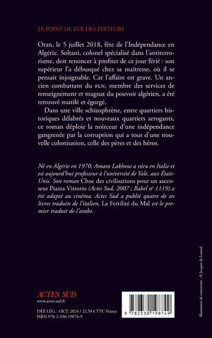 Oran, le 5 juillet 2018, fête de l'Indépendance en Algérie. Soltani, colonel spécialisé dans l'antiterrorisme, doit renoncer à profiter de ce jour férié : son supérieur l'a débusqué chez sa maîtresse, où il se pensait injoignable. Car l'affaire est grave. Un ancien combattant du FLN, membre des services de renseignement et magnat du pouvoir algérien, a été retrouvé mutilé et égorgé. Dans une ville schizophrène, entre quartiers historiques délabrés et nouveaux quartiers arrogants, ce roman déploie la noirceur d'une indépendance gangrenée par la corruption qui a tout d'une nouvelle colonisation, celle des pères et des héros.