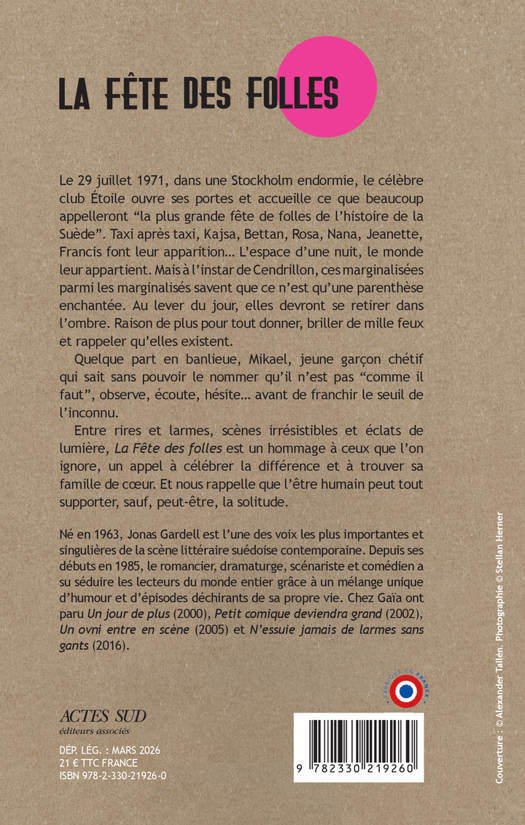 Le 29 juillet 1971, dans une Stockholm endormie, le célèbre club Étoile ouvre ses portes et accueille ce que beaucoup appelleront "la plus grande fête de folles de l'histoire de la Suède". Taxi après taxi, Kajsa, Bettan, Rosa, Nana, Jeanette, Francis font leur apparition... L'espace d'une nuit, le monde leur appartient. Mais à l'instar de Cendrillon, ces marginalisées parmi les marginalisés savent que ce n'est qu'une parenthèse enchantée. Au lever du jour, elles devront se retirer dans l'ombre. Raison de plus pour tout donner, briller de mille feux et rappeler qu'elles existent. Quelque part en banlieue, Mikael, jeune garçon chétif qui sait sans pouvoir le nommer qu'il n'est pas "comme il faut", observe, écoute, hésite... avant de franchir le seuil de l'inconnu. Entre rires et larmes, scènes irrésistibles et éclats de lumière, "La Fête des folles" est un hommage à ceux que l'on ignore, un appel à célébrer la différence et à trouver sa famille de coeur. Et nous rappelle que l'être humain peut tout supporter, sauf, peut-être, la solitude.