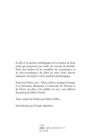 Cet ouvrage, La fête et la machine mythologique est constitué de deux essais qui proposent une étude du concept de festivité, « La connaissance de la fête » et « La fête et la machine mythologique » publiés en 1977. Il s'agit du tout premier texte traduit en français du philosophe italien Furio Jesi.