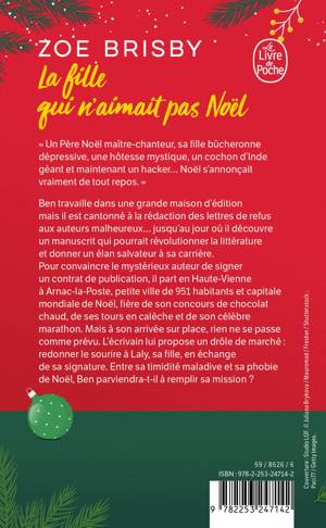 « Un Père Noël maître-chanteur, sa fille bûcheronne dépressive, une hôtesse mystique, un cochon d’Inde géant et maintenant un hacker… Noël s’annonçait vraiment de tout repos. » Ben travaille dans une grande maison d’édition mais il est cantonné à la rédaction des lettres de refus à des auteurs malheureux… jusqu’au jour où il découvre un manuscrit qui pourrait révolutionner la littérature et donner un élan salvateur à sa carrière. Pour convaincre le mystérieux auteur de signer son contrat d’édition, il part en Haute-Vienne à Arnac-la-Poste, petite ville de 900 habitants et capitale mondiale de Noël fière de son concours de chocolat chaud, de ses tours en calèche et de son célèbre marathon. Arrivé sur place, rien ne se passe comme prévu. L’écrivain propose à Ben un drôle de marché : redonner le sourire à Laly, sa fille, en échange de sa signature. Entre sa timidité maladive et sa phobie de Noël, Ben parviendra-t-il à remplir sa mission ?