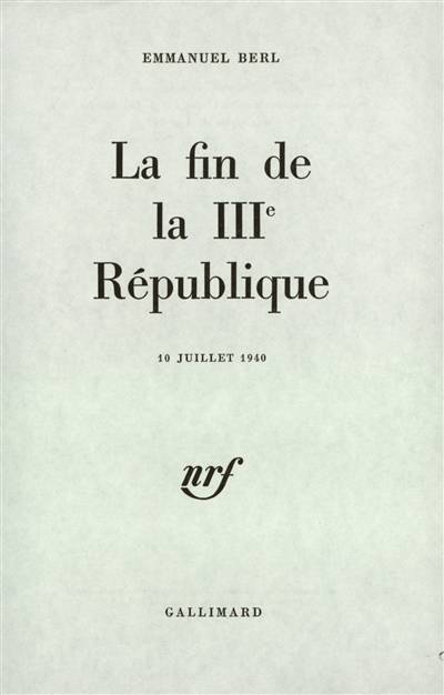 En mai 1968 paraît La Fin de la IIIᵉ République d'Emmanuel Berl. Témoin privilégié des semaines qui vont de l'attaque allemande du 10 mai 1940 à l'avènement du régime de Vichy, Berl met son talent d'écrivain au service de ses exceptionnelles connaissances du monde politique pour restituer ces moments qui virent le désastre militaire de la France et la disparition de la République. Partisan des accords de Munich, hostile à la déclaration de guerre en 1939, Berl est appelé dans l'entourage du maréchal Pétain devenu chef du gouvernement. Il quittera Vichy dès le 25 juillet, mais aura eu le temps d'écrire deux des discours prononcés par Pétain entre la demande d'armistice à l'Allemagne et la fin de la IIIᵉ République, le 10 juillet 1940. Qui ne connaît ces formules qui firent les beaux jours de la propagande vichyssoise, avant de figurer dans tous les livres d'histoire : "Je hais les mensonges qui vous ont fait tant de mal" et "La terre, elle, ne ment pas" ? Réédité dans la collection "Témoins", l'ouvrage de Berl est accompagné d'un dossier destiné à le replacer dans le cours de son oeuvre comme dans son contexte, et à montrer comment il fut accueilli en 1968, époque de réflexion politique bouillonnante, où l'historiographie de Vichy n'était pas encore nourrie d'archives. "Chez Berl, ce n'est pas l'intelligence seule qui parle, c'est aussi le sentiment, celui d'un homme qui ne connaît pas la haine", écrit dans sa préface Bernard de Fallois, qui fut l'ami de Berl, avant d'être l'éditeur de ses Essais.