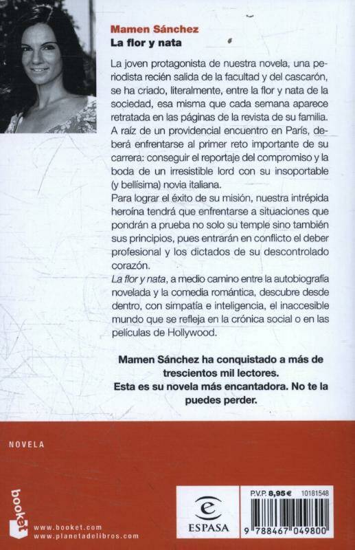 La joven protagonista de nuestra novela, una periodista recién salida de la facultad y del cascarón, se ha criado, literalmente, entre la flor y nata de la sociedad, esa misma que cada semana aparece retratada en las páginas de la revista de su familia.á A raíz de un providencial encuentro en París, deberá enfrentarseáal primer reto importante de su carrera: conseguir el reportajeádel compromiso y la boda de un irresistible lord con una insoportable (y bellísima) novia italiana.á Para lograr el éxito de su misión, nuestra intrépida heroínaátendrá que enfrentarse a situaciones que pondrán a pruebaáno sólo su temple sino también sus principios, pues entraránáen conflicto el deber profesional y los dictadosáde su descontrolado corazón.á La flor y nata, a medio camino entre la autobiografía noveladaáy la comedia romántica, descubre desde dentro, con simpatíaáe inteligencia, el inaccesible mundo que se reflejaáen la crónica social o en las películas de Hollywood. Mamen Sánchez ha conquistado a más de trescientos mil lectores.áEsta es su novela más personaláy encantadora. No te la puedes perder.
