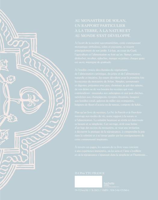 À l’inédite croisée des chemins du végétarisme, de l’alimentation carémique, du jeûne et de l’alimentation naturelle et intuitive, les sœurs dévoilent pour la première fois les recettes du monastère de Solan. Simples, savoureuses et digestes, préparées avec peu, choisissez au gré des saisons, de vos désirs ou de vos besoins les recettes qui vous conviendront : moussaka aux aubergines et aux pois chiches, tartelettes aux champignons, tyropita chypriote, lasagnes aux lentilles corail, galettes de millet aux trompettes, beignets de fleurs d’acacia ou de sureau, compote de kakis…