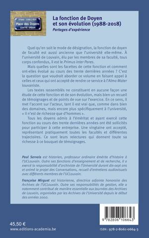Tous ceux qui ont fréquenté l'université ont, un jour ou l'autre rencontré la figure du Doyen de Faculté. Mais qui sait réellement ce qui se cache derrière cette appellation ? Tenter de pénétrer dans cette expérience spécifique par le biais du témoignage de ceux qui ont accepté, au fil des décennies, de l'assumer au service de l'institution universitaire constitue tout l'objectif de ce volume.