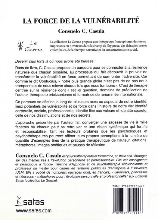 Devenir plus forts là où nous avons été blessés : Dans ce livre, C Casula propose un parcours pour se connecter à la résilience naturelle que chacun possède, au processus qui fait découvrir le pouvoir de transformer la vulnérabilité en force permettant de surmonter l'adversité. Car comme le dit Confucius, «notre plus grande gloire n'est pas de ne pas nous tromper mais de nous relever chaque fois que nous tombons». C'est de thérapie centrée sur la résilience dont il est ici question, domaine de prédilection de l'auteur, thérapeute ericksonienne et formatrice de renommée internationale. Ce parcours se décline le long de plusieurs axes ou aspects de notre identité, lieux potentiels de vulnérabilité et de force dans l'histoire de notre vie : identité corporelle, sociale, professionnelle, identité liée aux valeurs et identité secrète, celle de nos dissimulations et de nos secrets. L'approche présentée par l'auteur fait converger une sagesse de vie à mille facettes où chacun peut se retrouver et une vision systémique qui fortifie et responsabilise. Tant les lecteurs profanes que les psychologues et psychothérapeutes pourront affiner leurs propres perceptions à la lumière de quantité d'exemples tirés de la pratique thérapeutique de l'auteur, citations, métaphores, images poétiques et pauses de réflexion.