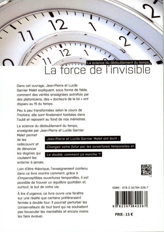 Jean-Pierre et Lucile Garnier Malet expliquent dans cet ouvrage, sous forme de fable, comment des vérités enseignées autrefois par des platoniciens, des « docteurs de la loi » ont disparu au fil du temps. Peu à peu transformées selon le cours de l'histoire, elles sont finalement tombées dans l'oubli et reposent au fond de nos mémoires. La science du dédoublement du temps, enseignée par Jean-Pierre et Lucile Garnier Malet permet de les redécouvrir et de dénoncer les dogmes qui voulaient les enterrer à jamais. Loin d'être théorique, l'enseignement contenu dans ce livre montre comment, grâce à d'imperceptibles ouvertures temporelles, il est possible de trouver un équilibre quotidien et, surtout, le but de notre vie. A lire d'urgence, ce livre ouvre une fenêtre sur une réalité que certains préféreraient fermée à double tour. Il pourrait perturber les conservateurs de tout bord qui ne souhaitent pas bousculer les mentalités et encore moins les faire évoluer.