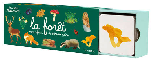 Grâce à ce coffret, les tout-petits partent à la découverte de l'univers forestier : cerf, blaireau, chouette hulotte, mais aussi mousse, écorce, pomme de pin...